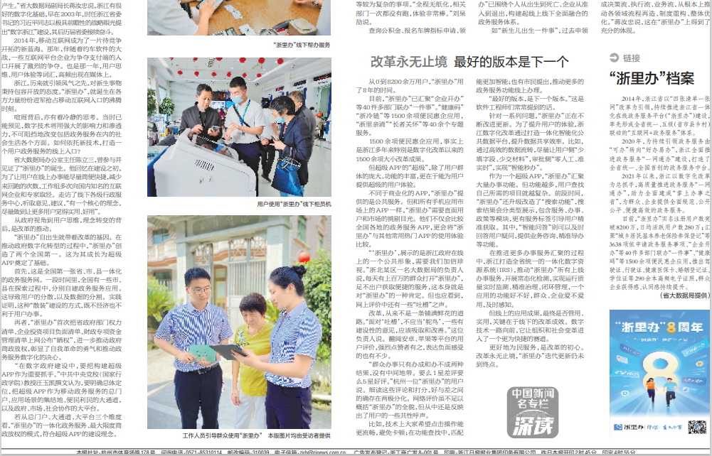 8年来,“浙里办”悄然改变着浙江政务服务模式。从办事看脸面,到办事看界面,“浙里办”集成公积金提取、入学报名、企业开办等便民惠企应用1500余项,实名注册用户已达8200多万,每天有280万人打开办理相关业务。近日,“浙里办”还被评为浙江数字经济创新发展的标志性成果。
